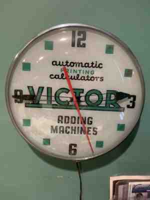 Vintage Victor Adding Machines Lighted Advertising Clock Sign WORKS. Condition is Used. The time mechanism works perfect. It does light up, but there is no bulb in it right now. It needs a led bulb to make it pop. Great condition. Only small flaw that could be fixed is on the bottom of the metal frame. (see photo). Please email me with any questions. Thanks